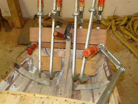 und da drauf die neue Planken - 10mm Sapelli bis der Rumpf wieder vollständig geschlossen und geschliffen ist - der alte Farbaufbau innen wird äußerst effizient durch Sandstrahlen entfernt.