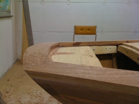 das Ergebnis vom vor vielen Jahren aufgenagelten Sperrholzdeck sind Fragmente vom Mahagoni am Schandeck